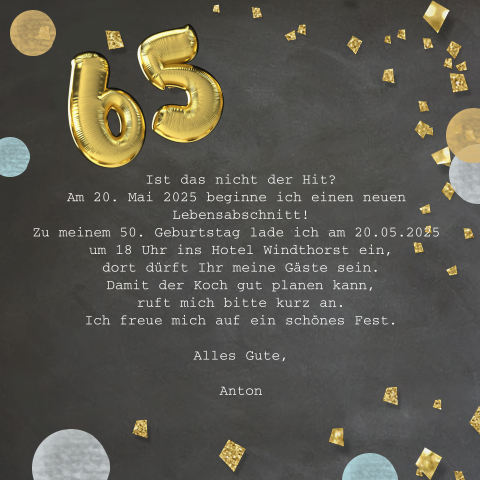Einladung Zum 65 Geburtstag Und Gelben Ballonzahlen Und Konfetti